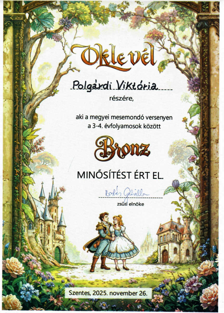 Polgárdi Viktória (3.a) a Szentesen, 2025. november 26-án rendezett Megyei Mesemondó Versenyen bronzminősítésben részesült. Tehetséges diákunk korábban az iskolai majd a városi fordulóban is remekül szerepelt: Lázár Ervin Csodapatika c. történetével bűvölte el a közönséget. Szívből gratulálunk a nagyszerű teljesítményhez neki és felkészítőjének, Nagy Dóra tanító néninek.