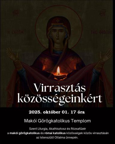 2025/2026 Az Istenszülő Oltalma ünnepén közös virrasztást tartanak a római katolikus testvérekkel templomukban. 17 órától Szent Liturgiát végeznek, majd Akathisztoszt rózsafüzérrel. Mindenkit szeretettel hív és vár a Makói Görögkatolikus Parókia 2025. október 01. hitélet plébánia