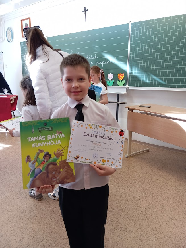 A vármegyei versmondó versenyen, a hódmezővásárhelyi Szent József Kertvárosi Katolikus Általános Iskolában, városunkat és iskolának Nacsa Olivér Leó 2.a osztályos tanuló képviselte. Olivér ismét nagyon színvonalasan szerepelt, melyet a zsűri ezüstminősítéssel díjazott. Felkészítője Kádárné Varga Szabina tanárnő volt. Gratulálunk!